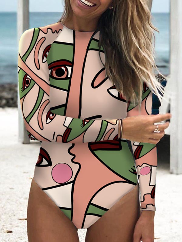 Solid Color Long Sleeve Hollow High-Waisted Simple Wetsuit Swimwear